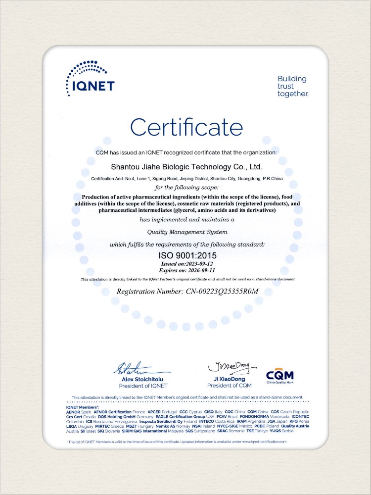 汕頭佳禾生物科技有限公司是一家致力于氨基酸及其衍生物研發(fā)、生產(chǎn)和銷售的國(guó)家高新技術(shù)企業(yè),先后通過(guò)了國(guó)家藥品GMP認(rèn)證,ISO9001質(zhì)量體系認(rèn)證、ISO14001環(huán)境管理體系認(rèn)證。目前,公司擁有“廣東省專精特新中小企業(yè)”、“廣東省氨基酸產(chǎn)品工程技術(shù)研究中心”、“汕頭市生物發(fā)酵工程技術(shù)研究開發(fā)中心”、“汕頭市知識(shí)產(chǎn)權(quán)優(yōu)勢(shì)企業(yè)”、“多項(xiàng)國(guó)家發(fā)明專利”、“廣東省守合同重信用企業(yè)”等多項(xiàng)資質(zhì)和榮譽(yù),旗下“佳禾牌”系列產(chǎn)品已成為原料藥行業(yè)知名品牌。 新泰市佳禾生物科技有限公司成立于2012年8月,注冊(cè)資金2億元,公司位于山東泰安新泰市新汶工業(yè)園區(qū),是國(guó) 家級(jí)高新技術(shù)企業(yè)、山東省“專精特新”企業(yè)、山東省制造業(yè)單項(xiàng)冠軍企業(yè)、泰安市科技型中小企業(yè)、泰安市農(nóng)業(yè)產(chǎn)業(yè)化龍頭企業(yè)、中國(guó)生物發(fā)酵產(chǎn)業(yè)協(xié)會(huì)理事單位。